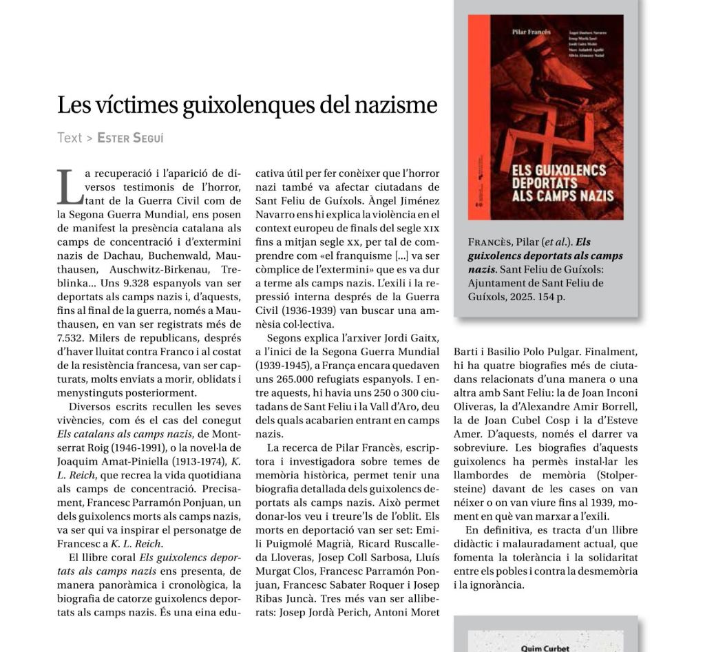 Darrer treball de memòria històrica, publicat aquest maig 2025 pel Museu d’Història de Sant Feliu de Guíxols: les biografies dels deu guixolencs que patiren l’horror del nazisme. La finalitat del projecte era poder instal·lar les llambordes de memòria, Stolpersteine, davant de les cases on van néixer o residir fins el 1939, moment que marxaren a l’exili. Set hi deixaren la pell, tres van sobreviure. Parlem de: